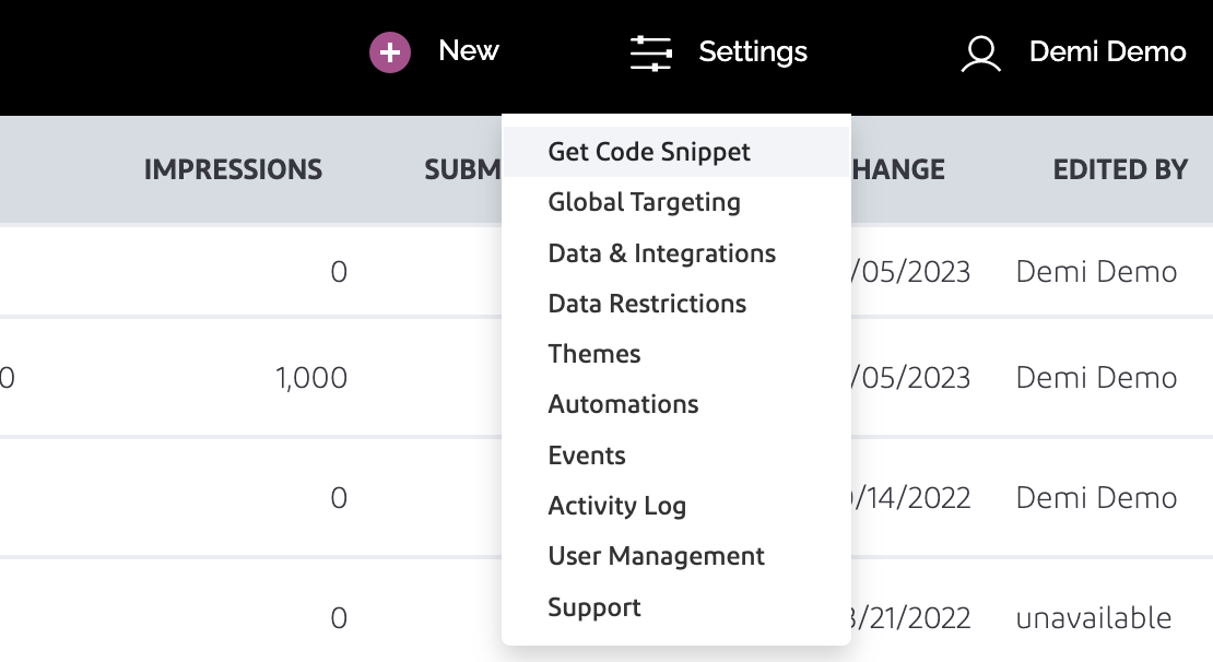 * **Get Code Snippet** This is your unique code snippet for your Pulse Insights implementation. See implementation documentation [here](https://docs.pulseinsights.com/implementing-pulse-insights-dev/implementing-in-email#implement-tag).