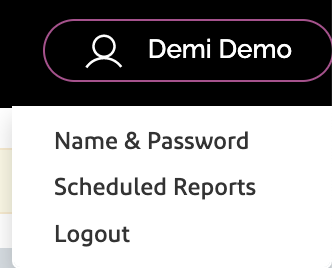 dropdown menu in the top right. Read more about account-level settings here. User-level account settings - Click on your name in the top right corner to reveal a dropdown where you can change your name & account password, set up Scheduled Reports, or Logout. If you have multiple accounts associated with your email, then all your accounts will be listed in this menu and you can switch between those accounts using this menu.