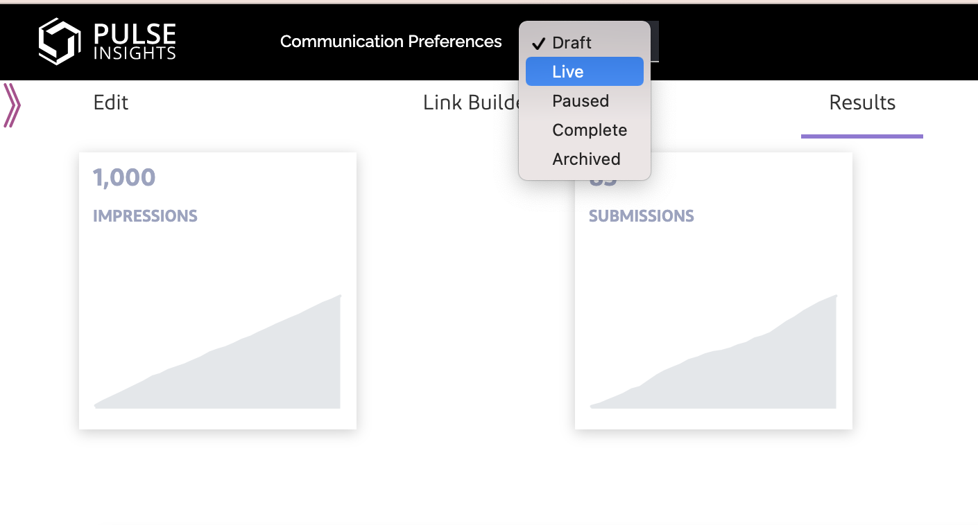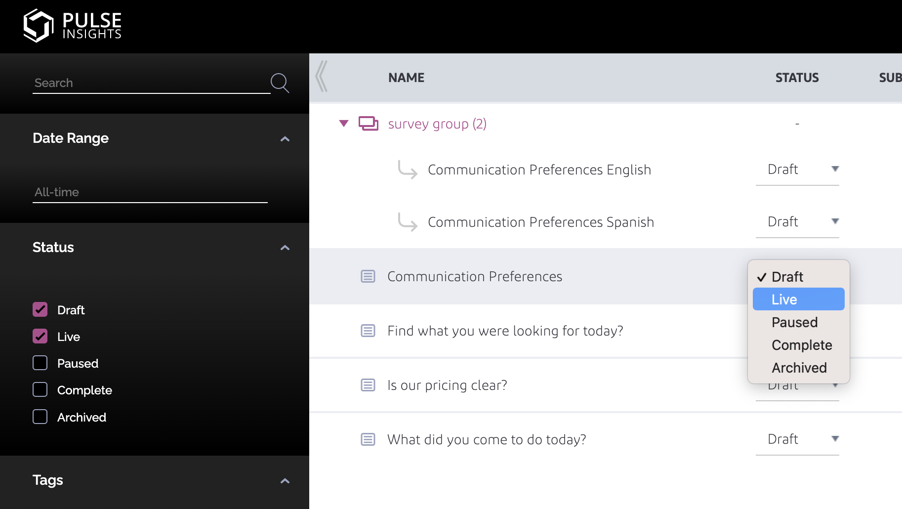 This status is ideal for when you'd like to temporarily stop the survey from being shown to users, but would like to set it live again in the near future. Paused surveys are hidden in the Dashboard view by default, but you can view Complete surveys by checking "Paused" in the left filter panel.