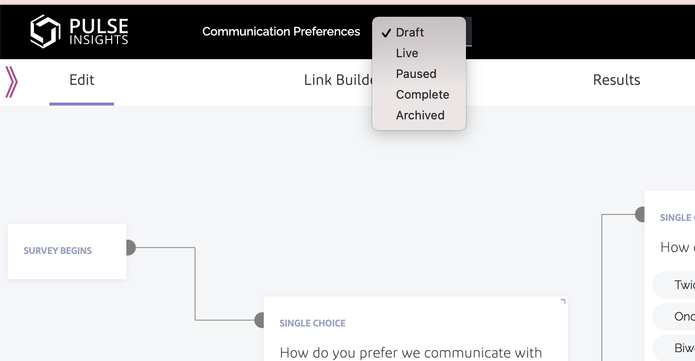 Use this status when you are making edits to a survey. Use this survey status when you want to use the Console's Live Preview mode.