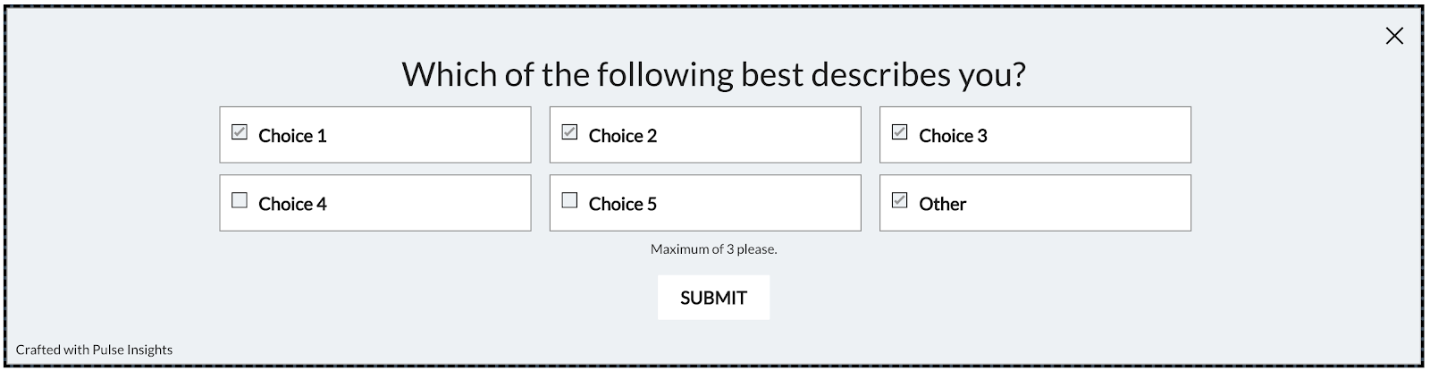 questions, you can set the maximum number of checkboxes the user can select. If you enable this option, you can enter the number of maximum responses a user can select (e.g. Select all that apply, up to 3).&#x20;