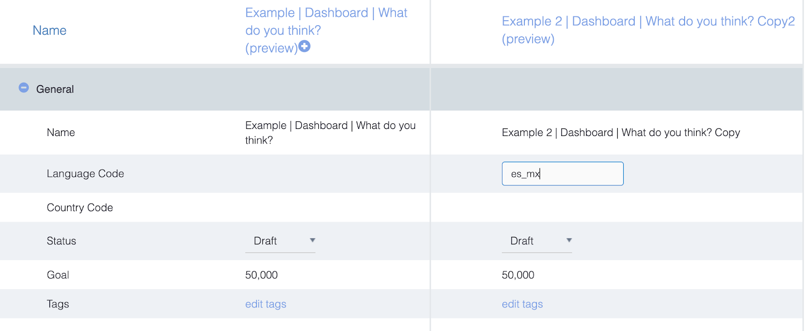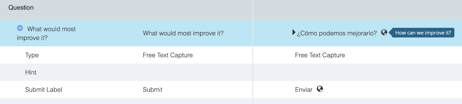 **Translations:** Enter the language code (see [here](http://www.lingoes.net/en/translator/langcode.htm) for ISO Language Codes) in the appropriate text field in the “General” section. When you enter your translated copy, hover over the globe icon to reveal a tooltip with the approximate English translation. This tool comes in handy when you are creating survey variants in different languages.
