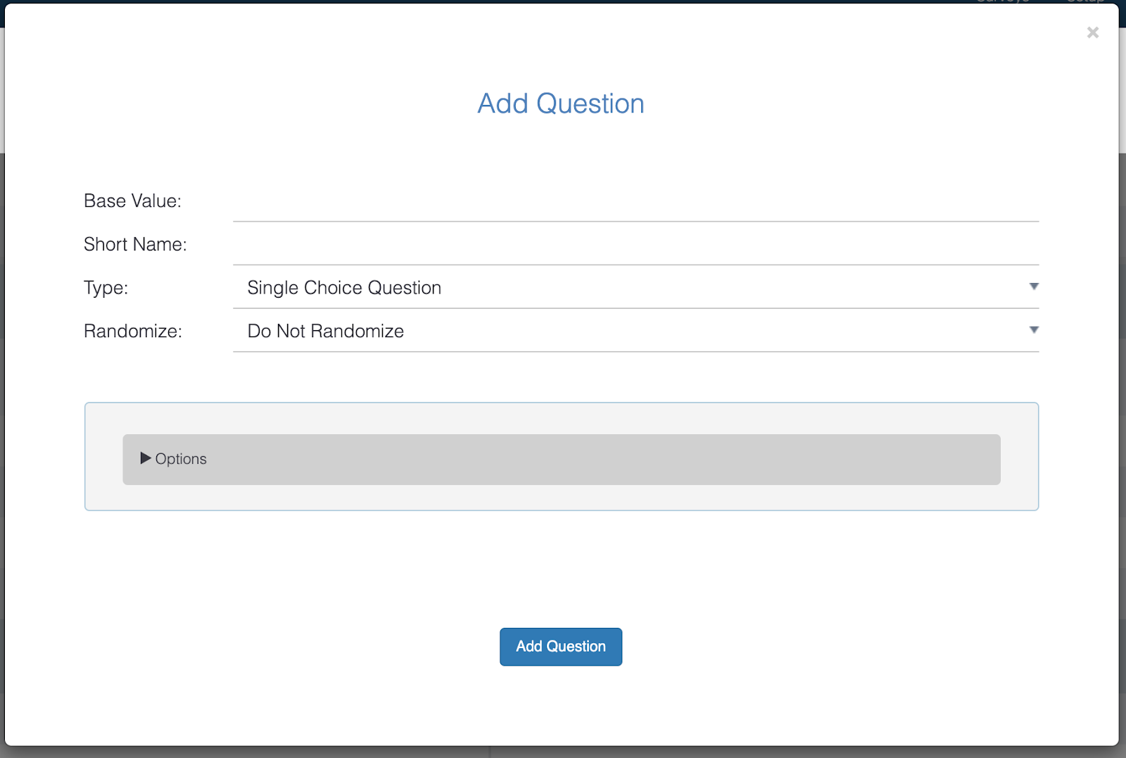 **To add questions:** Scroll down to the bottom of the page and click on the “Add Question” button on the bottom left. This will trigger the “Add Question” modal where you can pick the question type and define the question copy and short name label. You can also configure additional options, which vary depending on the question type.