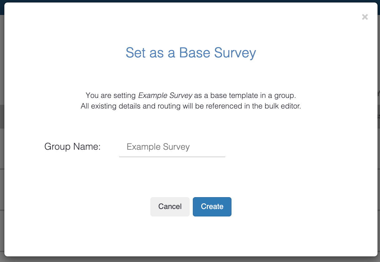 To create a Survey Group, you first need to create a base survey. Create a survey as you normally would. After creating the first survey, you can create a survey group from the main dashboard page. The survey you originally created will be your “base” survey and will serve as the template for the other surveys you create in the group.