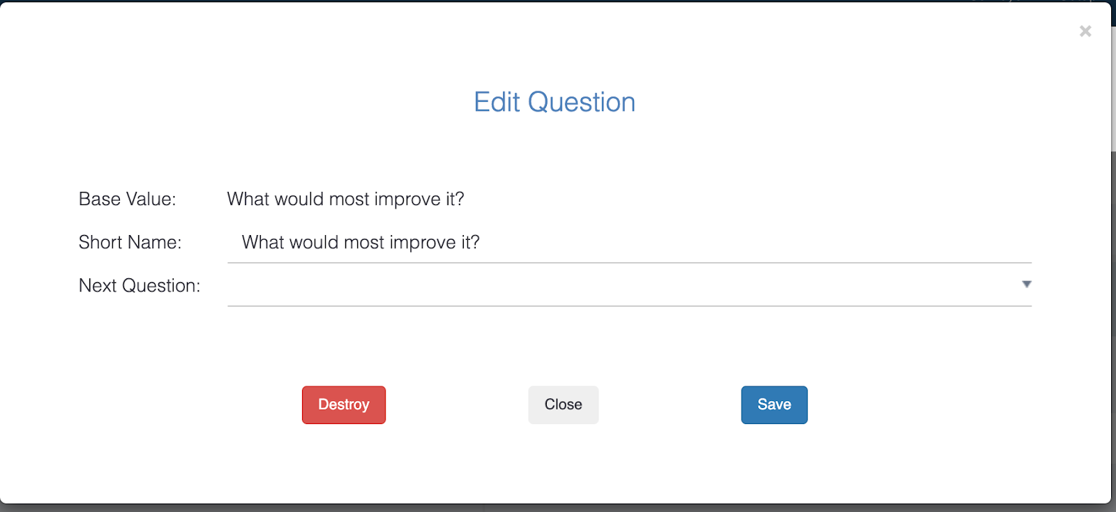 **To delete a question:** Double click on the question in the first column to trigger the “Edit Question” modal. Click “Destroy” to delete the question for *all surveys*.<br>
