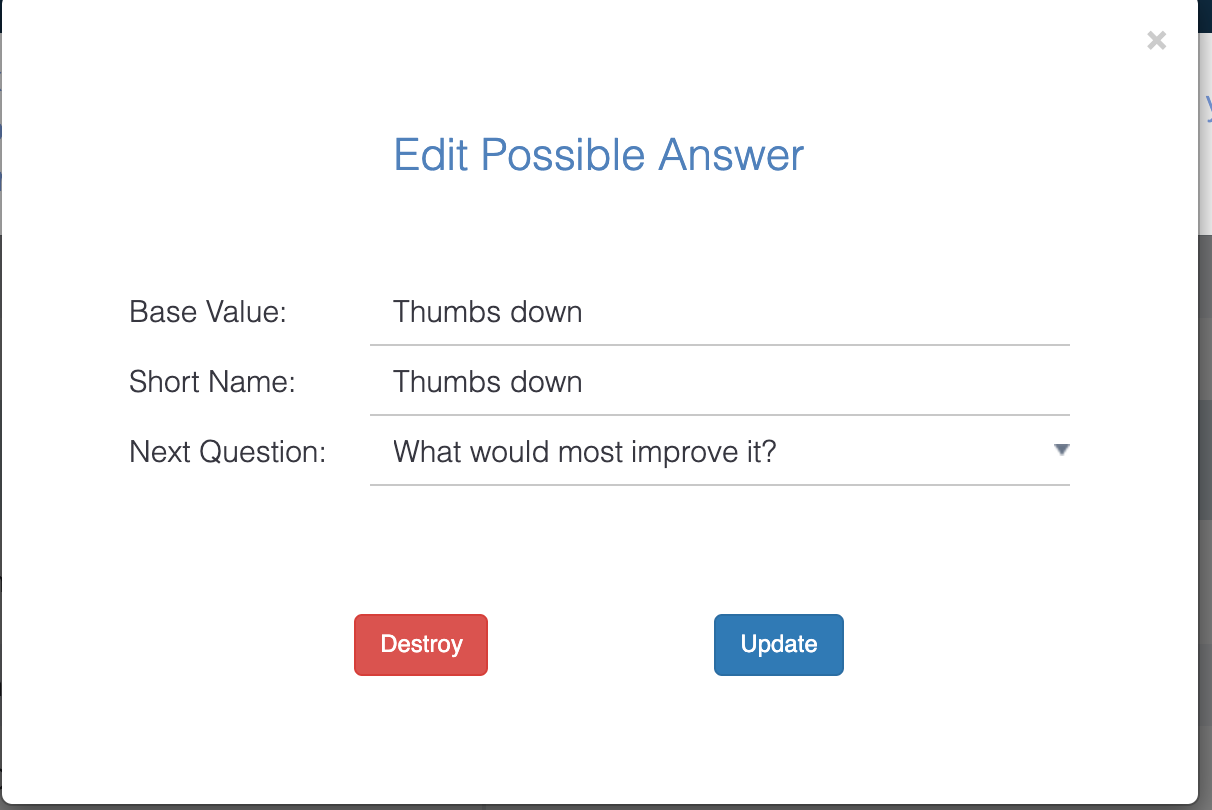 **To delete an answer:** Double click on the short name answer in the first column to pull up the “Edit Possible Answer” modal. Click on the “Destroy” button to delete the answer for the base survey for all the survey variants.&#x20;