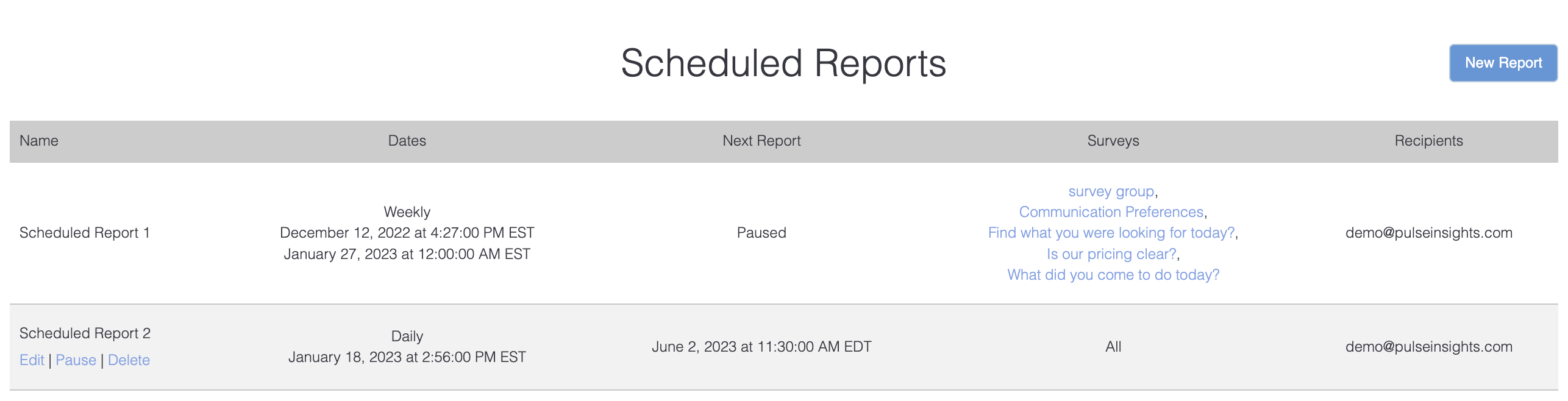 * Paused reports will say "Paused" in the "Next Report" column