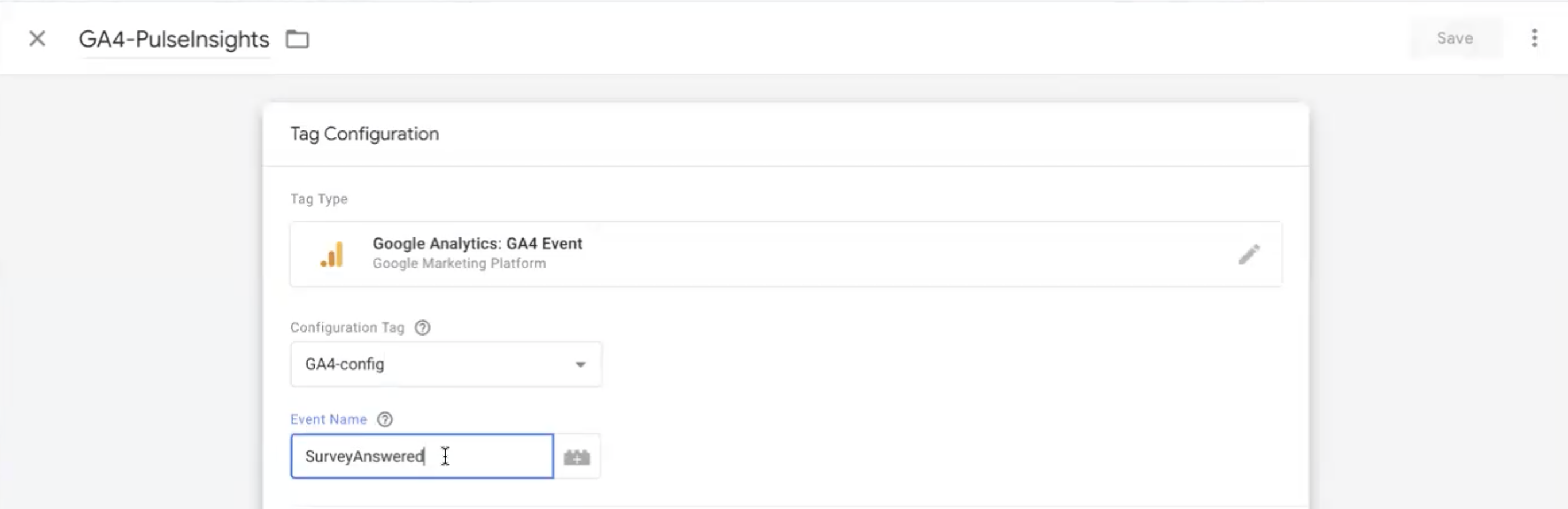 When a user answers any Pulse Insights question, Pulse Insights will set an event in Google Analytics with the answer text of what the user's response. You can, in turn, create segments in GA based on the responses in order to analyze behavior. This level of analytics in GA4 requires some setup steps, both in your tag manager and in Google Analytics.