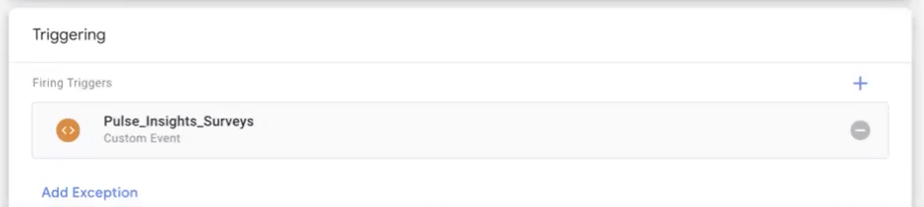 9. Lastly, in the Triggering section, click the edit icon, and choose the  `Pulse_Insights_Surveys` custom event (which was set up earlier in the [Create a Trigger](#first-create-a-trigger) section.